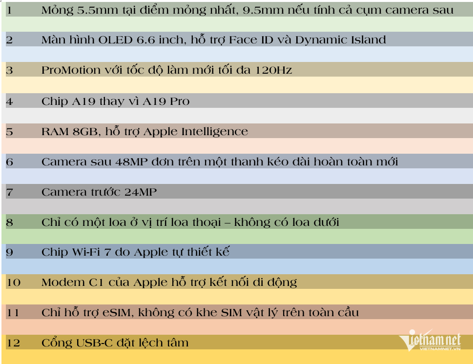 Những tính năng bị đánh đổi cho thiết kế siêu mỏng sẽ là chỉ có một camera sau, chỉ một loa và chip A19 thay vì chip A19 Pro mạnh mẽ hơn.