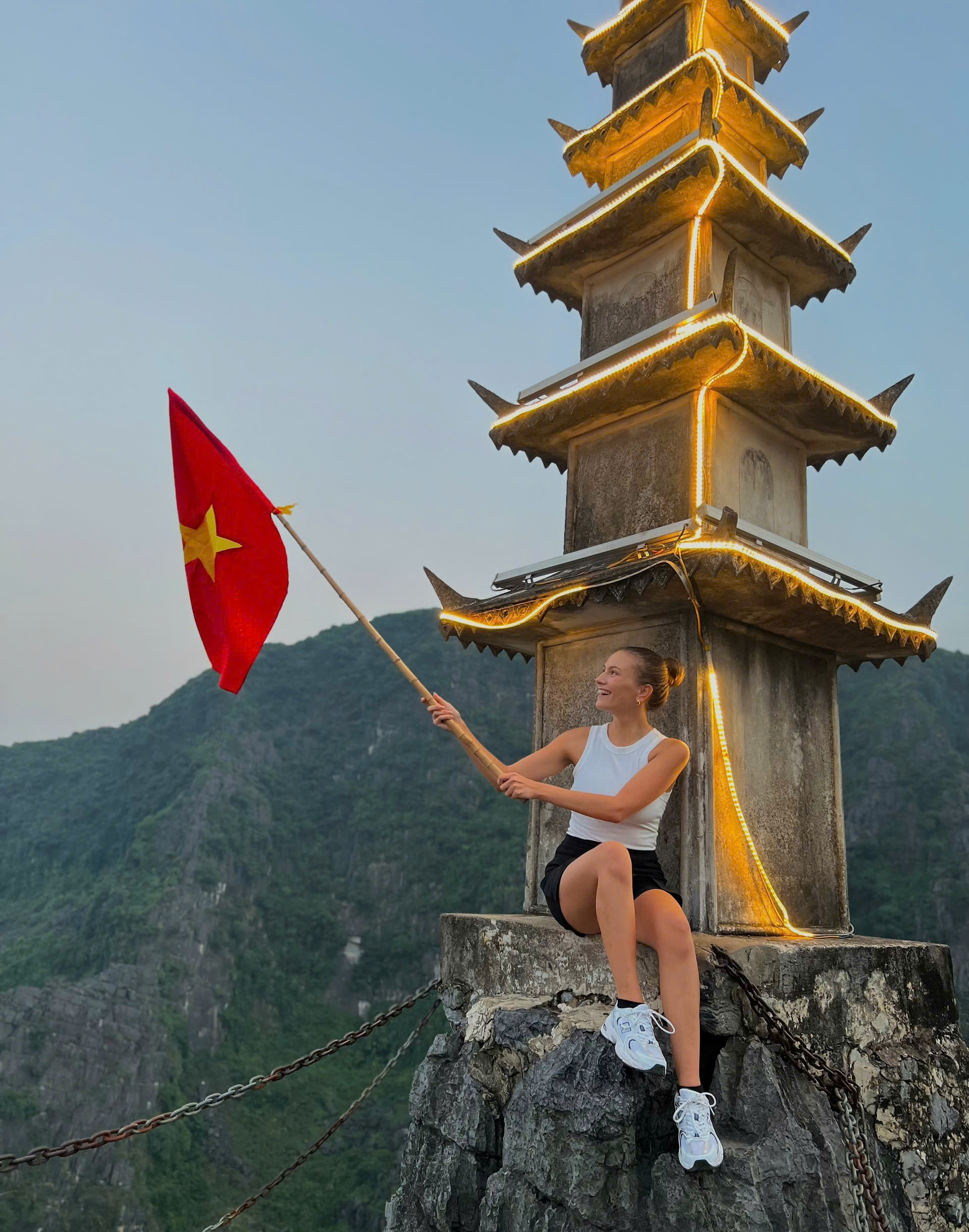 Có hai hướng trên đỉnh Ngọa Long là tháp sống ảo và bên kia là tượng rồng chầu Quán Âm. Du khách có thể ngắm trọn vùng Tam Cốc trong tầm mắt.